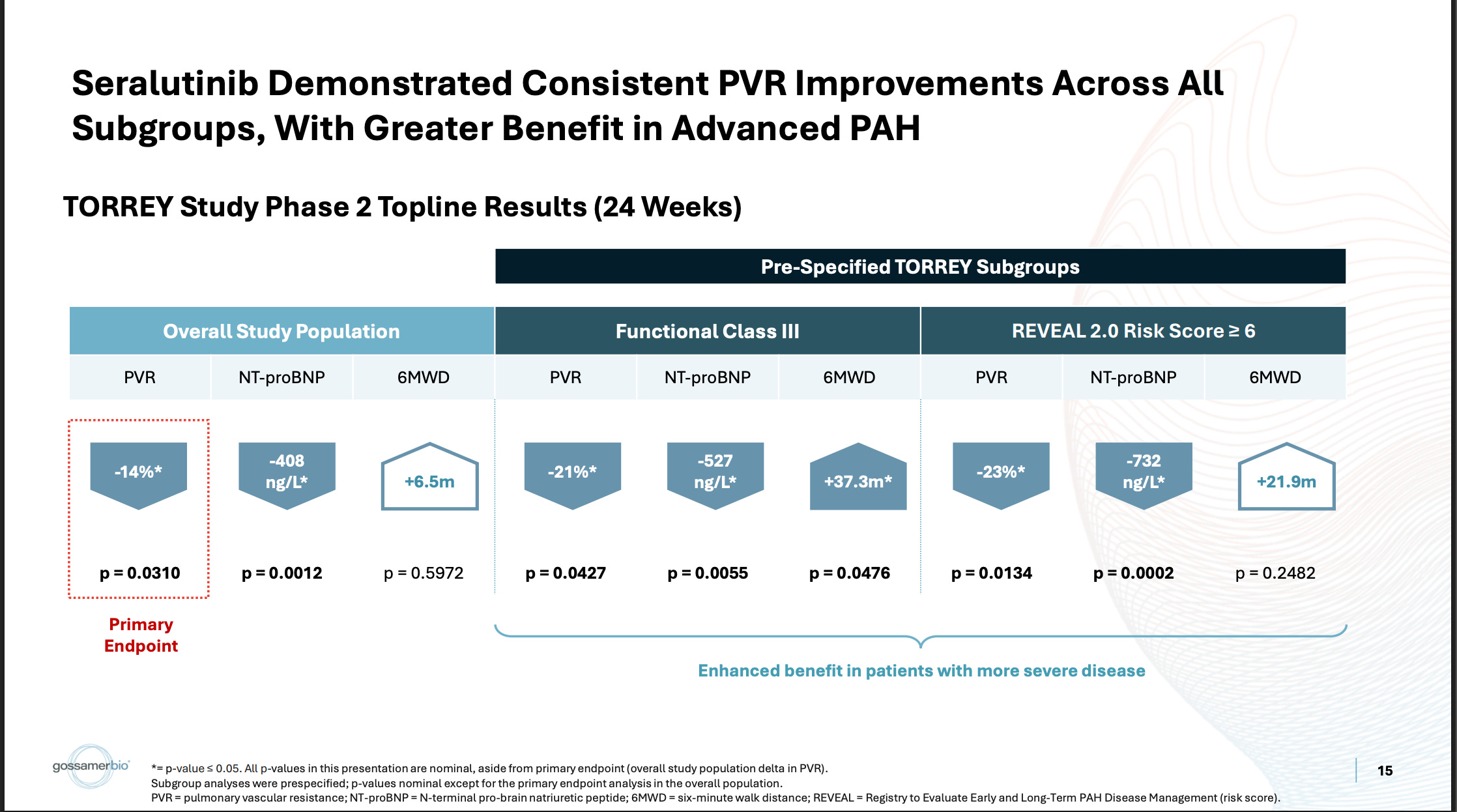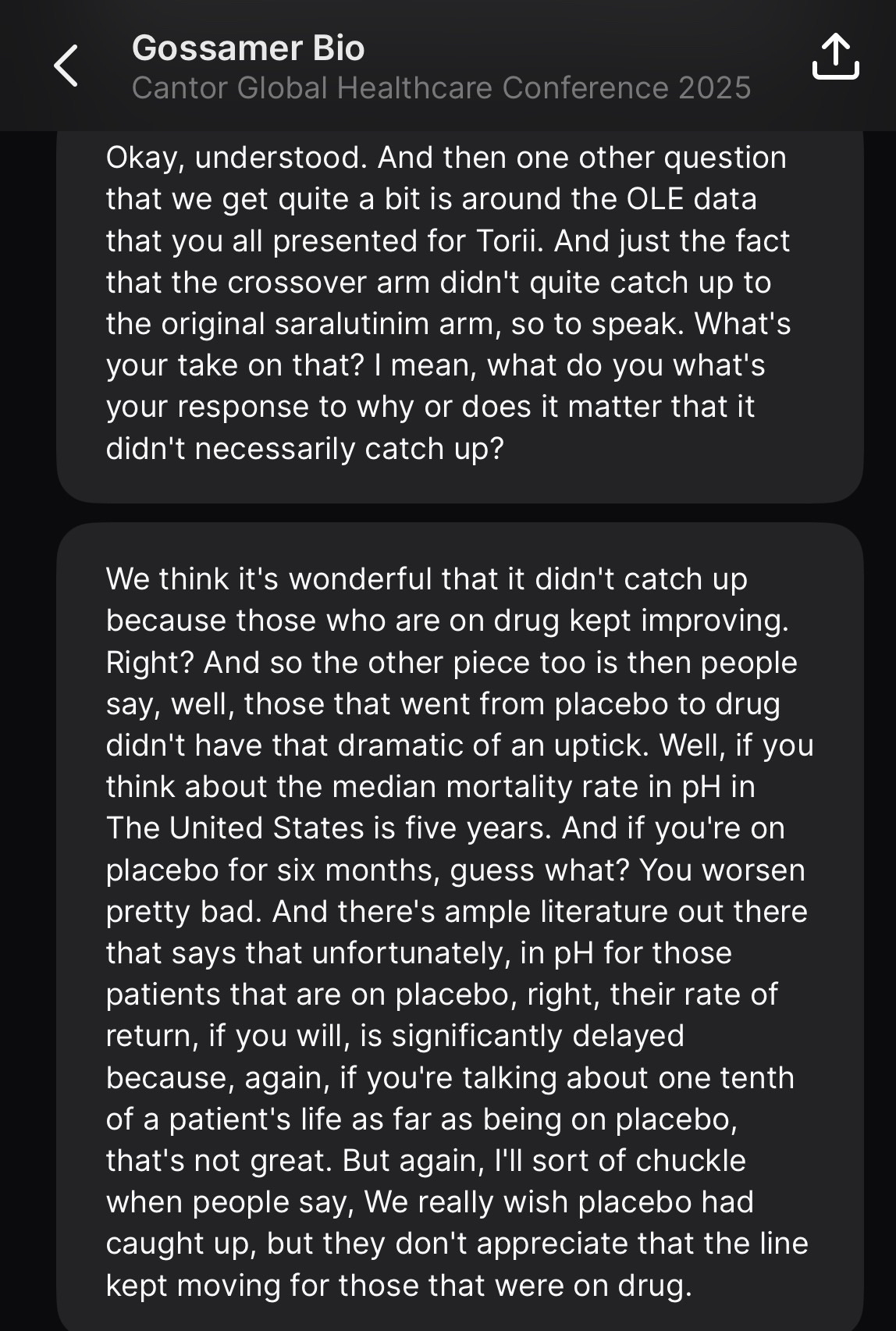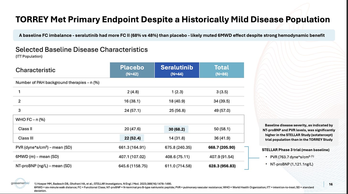They ran a placebo-controlled study, which showed a stat-sig reduction on the PVR biomarker, with very little 6MWD functional benefit. In the more severe WHO Class III population, they show a deeper PVR reduction and better 6MWD benefit. Generally, the bar for these drugs on PVR (well-established biomarker) is more like -20% in the pooled population, so despite being stat-sig, the market considered that endpoint to be underwhelming as well. The stock got pummeled on this data, indicating the market didn’t care much for this subgroup analysis, but it’s been the subject of increased interest and debate recently. GOSS has definitely gotten the visibility to tell their story lately. Some parts of this story make sense to me, others I do have some concerns about.