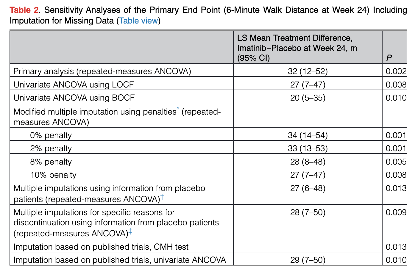 Let’s start with the imatinib hypothesis, which is the parent drug that has since spawned varying takes on the thesis in GOSS, AVTE, and now IKT. This data is interesting because it has yet to be replicated with any other TKI so many years later. The imatinib Ph3 publication is available here. The 6MWD data is stat sig positive, as you can see below: