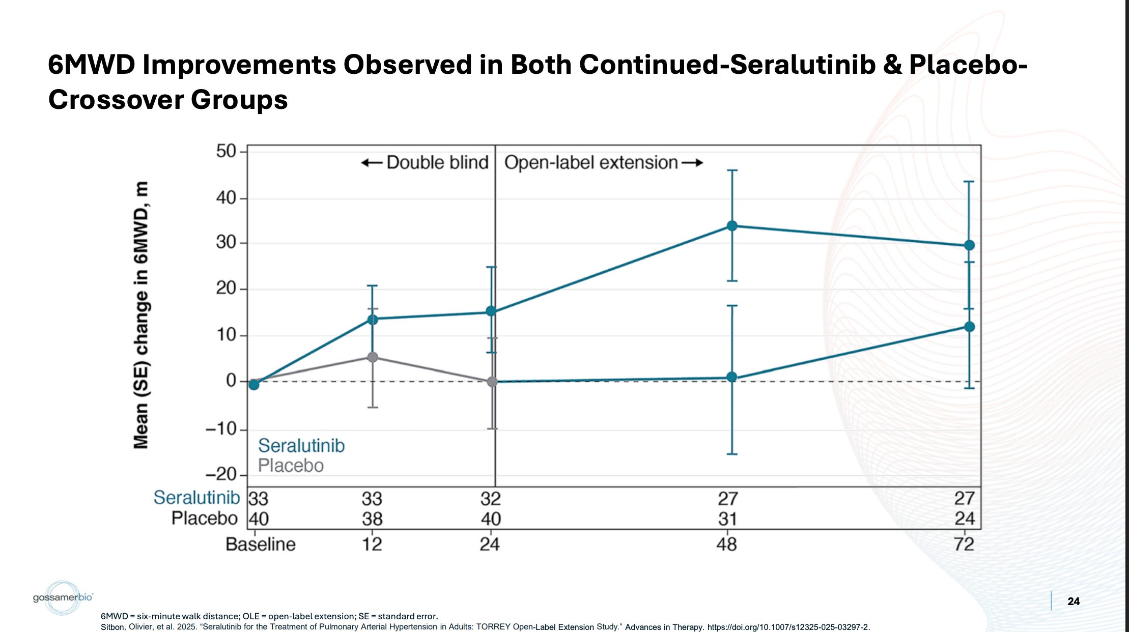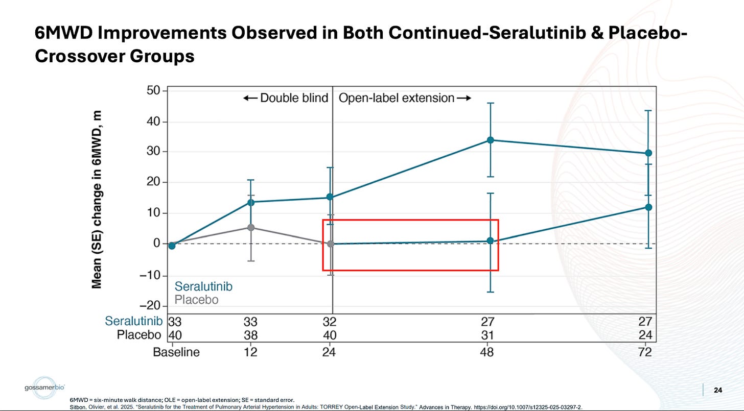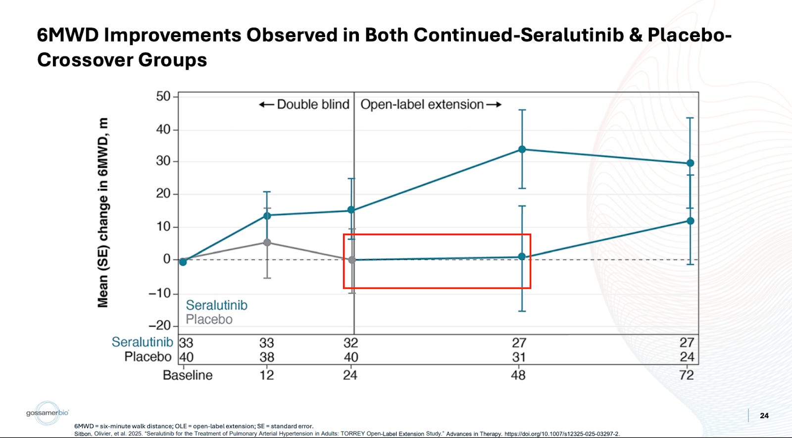 The placebo-crossed PVR underwhelms, and so does the corresponding 6MWD. The continued seralutinib data looks better, and so does the corresponding data. In my eyes, that’s not how I’d expect a heavily compromised 6MWD endpoint to behave. Even in small n subgroups and the OLE, it still correlates reasonably well with the biomarker. If there were severe QC issues in the dataset to the point that this data shouldn’t be relied upon… what are the odds that it would still correlate with PVR like that? I don’t really know what to make of this, because there are other verifiable examples of covid causing problems with 6MWT trials, but it’s confusing to me if nothing else.